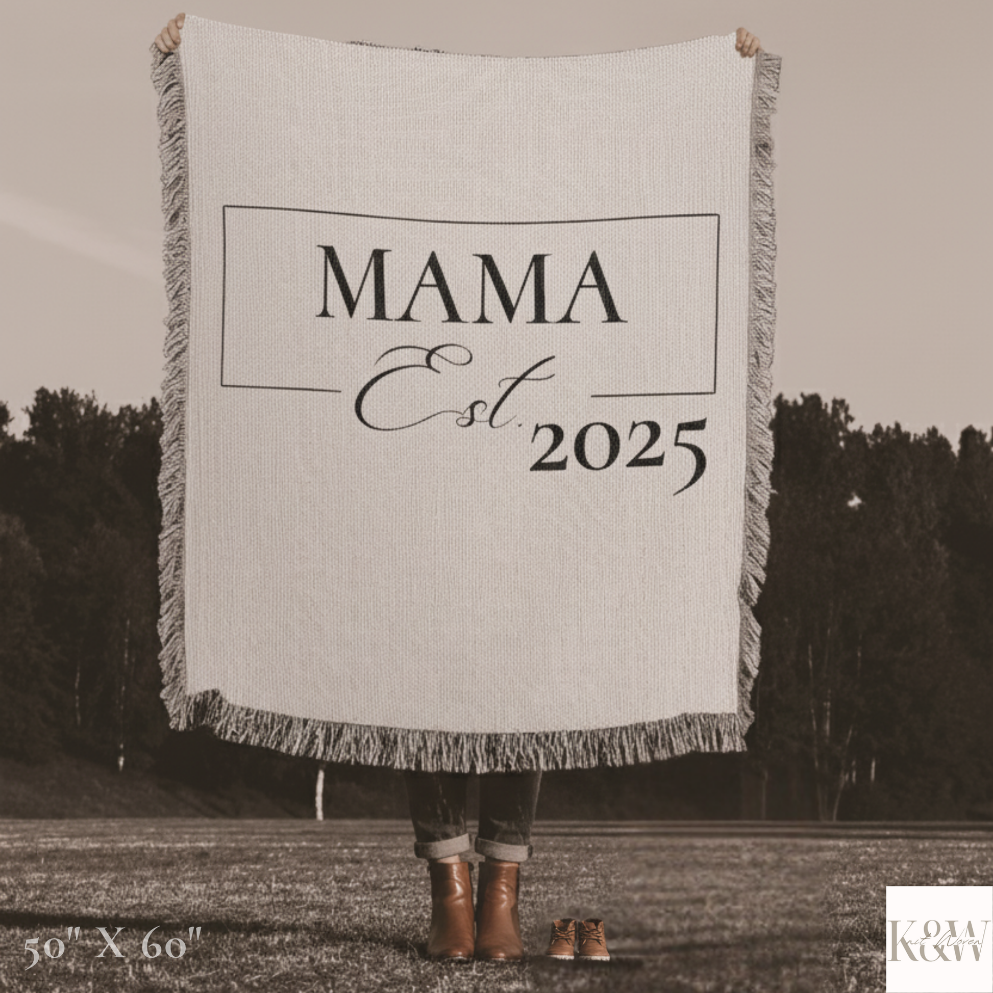 KNIT & WOVEN's custom throw blankets are fashioned in a minimalist style and are easily personalized with text (Mama est. 2025, Mama est. 2026, etc.) to showcase your motherhood journey!
